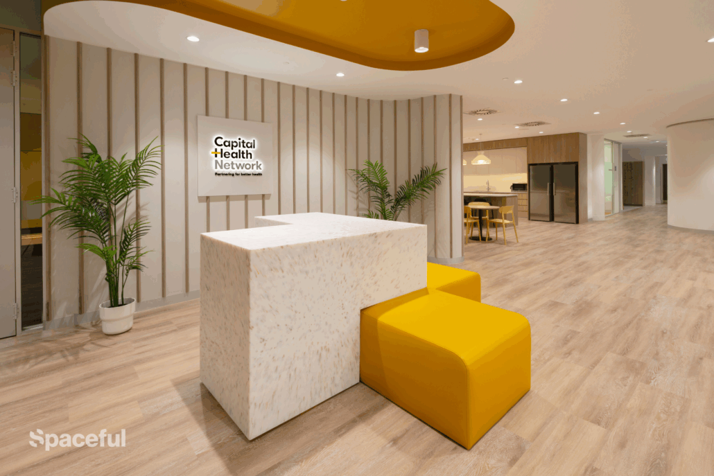 Inspired by CHN’s vision of a “summit horizon,” the fitout blends golden hues, Indigenous artwork, and biophilic design to promote wellbeing, inclusivity and connection. Spaceful’s thoughtful integration of colour, culture and form creates a workplace that reflects CHN’s commitment to peak health outcomes—for both their people and their community.